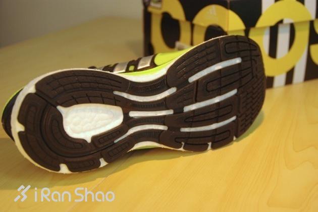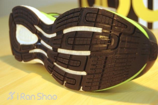 鞋底是鞋子的重要部分,所用Boost材料不如同门的 Energy 多。鞋底结构增加了防扭转的设计。在足弓处没有做特别支撑设计。而通过结构设计对前后掌进行了连接,减少缓冲过程中足弓的过度伸展。