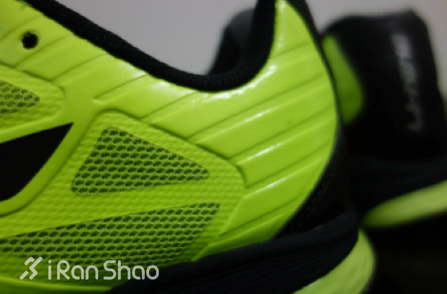 首先“双渡”的配色很讨喜,大自然的嫩绿色搭配稳重的黑色,整体颜色非常抢眼。鞋面细孔网布透气性不错。