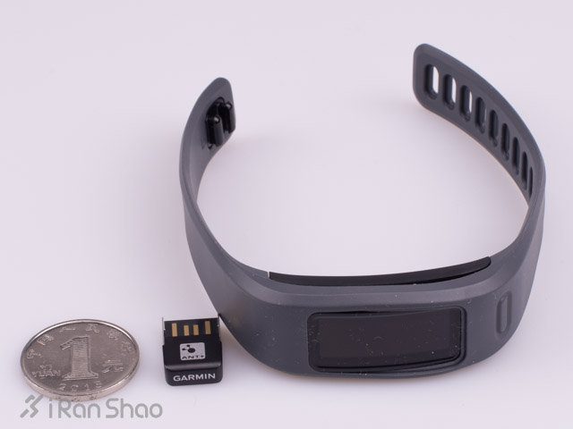 Vivofit配置了无线同步的适配器。适配器采用USB接口,同时使用ANT+ 协议。体积非常小。与一元钱硬币对比如图。