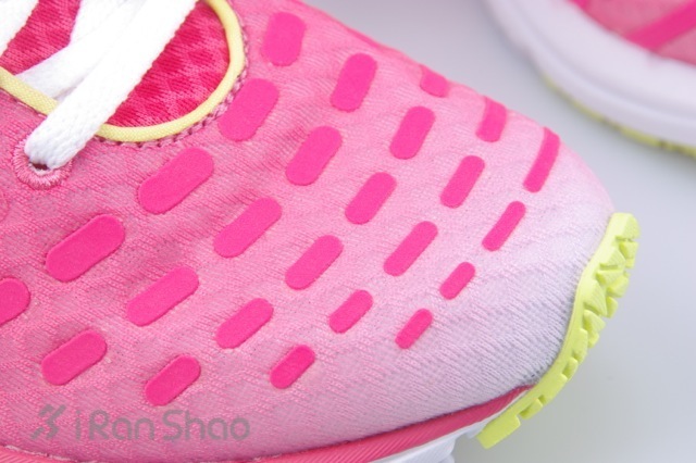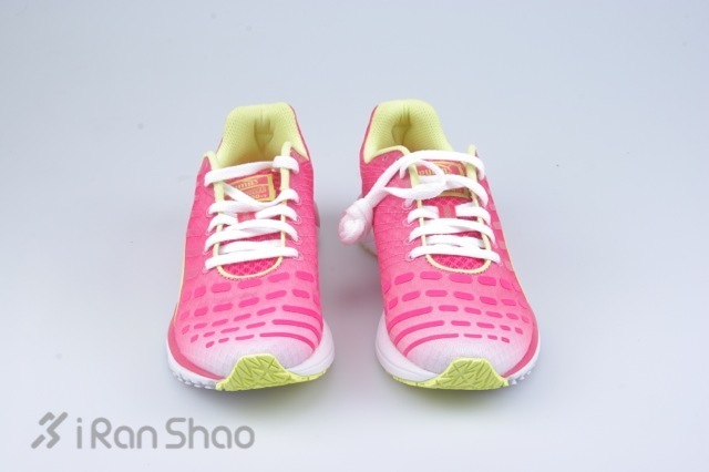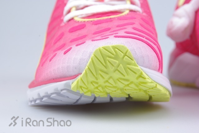 白色,粉色渐变的鞋身,配合黄绿色,白色的鞋底配色。鞋身比例合理,前掌宽度适中。