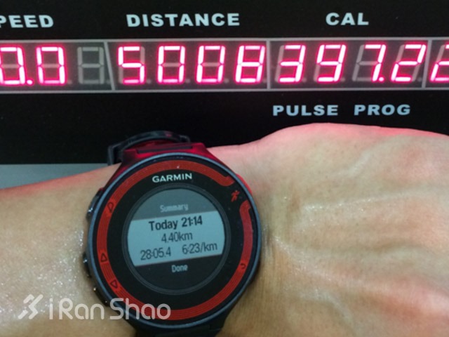 四、跑步机:由于220内置加速度传感器,可记录室内训练信息,笔者就此在跑步机(5km)上测试,但跑完显示的数据误差较大。