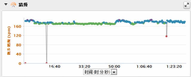 下图分段数据可知配速上去后步频相应也会提升,但不排除有些误差,仅做参考(笔者无外挂计步器,无法做同级测评)。