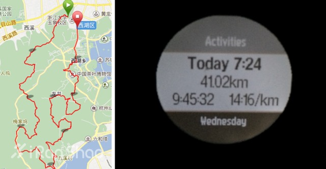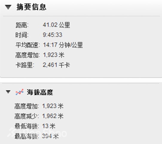 2、GPS爬升下降数据是否准确(同时佩戴Suunto Ambit2做海拔参考):Suunto表的爬升基本和官网一致,显示2400m+,而220有所误差(最高的天竺山有413m)