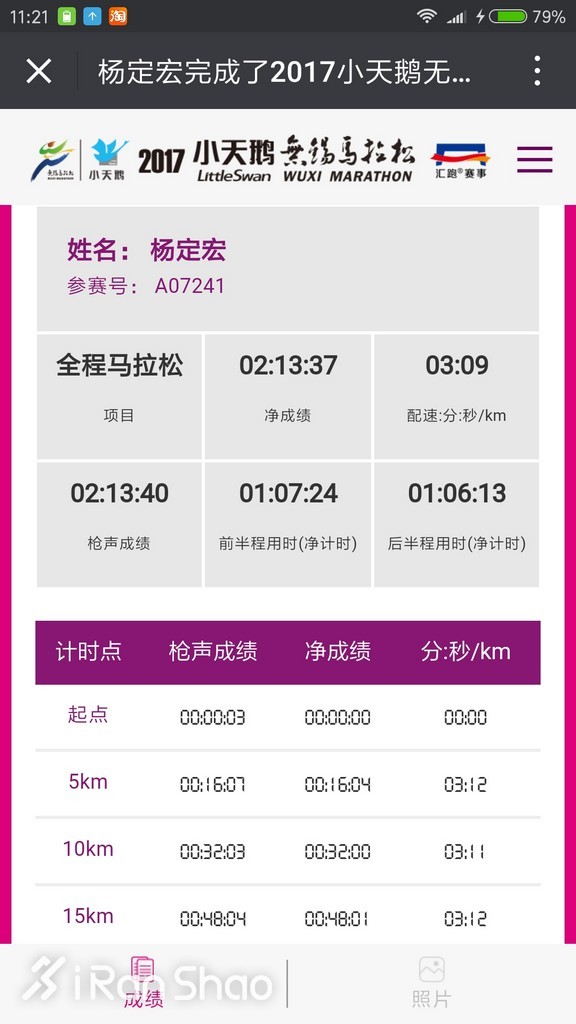 最后两公里多,杨定宏的配速稍稍放慢到3:14,以2:13:37的净成绩完赛,将尘封了六年的PB缩短3分02秒。
