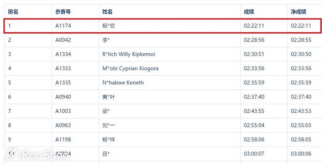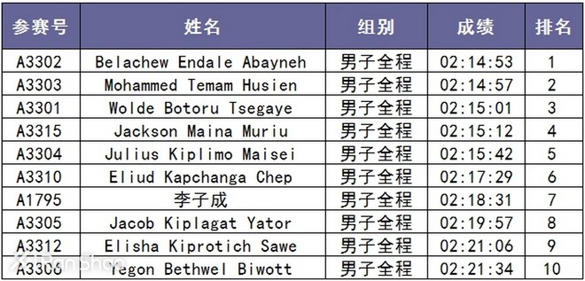 云南专业队名将杨定宏跑出2:13:40的今年国内最快成绩,同时将PB缩短3分钟。作为非特邀选手,他比冠军只慢27秒,战胜9名非洲高手。 - 体制外第一高手李子成以今年国内第二好成绩2:15:21排名第七,超过7名非洲精英;值得一提的是,此役距他以2:18:31收获海南马拉松国内第一(国际第七)仅隔三周。