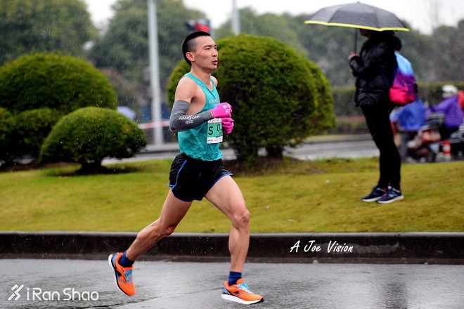 这次来无锡,李子成准备了两双跑鞋,都是赞助商圣康尼的。其中一双透水效果和抓地非常好,另一双弹性、缓冲比较好,但稍微厚重一点,下雨蹬地时会打滑。