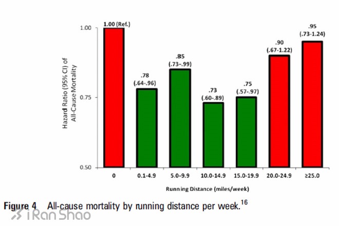 从图中可以看出,和不跑步的人相比,跑者每周随着跑量增加,心脏病致死率先是降低,然后到达最低点之后反弹,超过20英里之后数据基本和不跑步的人差不多了。