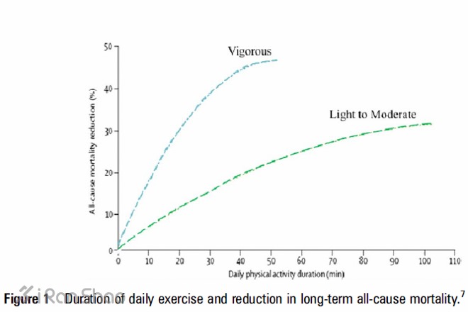 这个图的意思简而言之,就是高强度持续运动40-50分钟这种方法训练,可以降低约50%由心血管疾病导致的死亡,并且在此基础上再增加运动时间,对降低死亡率的贡献不再显著;以较弱至中等强度持续运动约100分钟,可以降低约30%由心血管疾病导致的死亡,同样,在此基础至上再增加运动时间,进一步的效果不再显著。