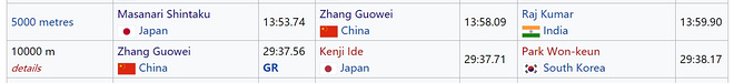 从源自维基百科的下表可以看出,他险胜日本选手井手健二(Ide Kenji)优势仅为0.15秒。