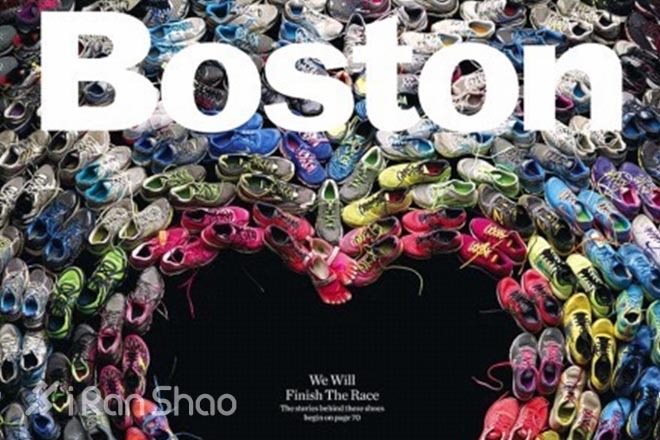 (题图:We Will Finish The Race! 爆炸案过后,波士顿杂志寻觅到了因爆炸案而未完成2013波士顿马拉松比赛的选手,向他们借来了在自己在波士顿马拉松比赛中所穿着的跑鞋琳琅满目的品牌和款式,配上的标语,向大家介绍跑者的故事。)
