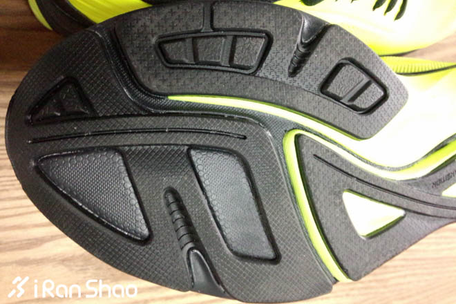 中底是中后掌使用“李宁云”材质与EVE相互配合的设计,“李宁云”材料只占到约四分之一的面积,整个舒适度方面没有NIKE LUNAR的那种软,也不会有“李宁云”跑鞋的那种明显的韧,整体上说没有很惊喜的缓震效果,通过2次15K的练习后,脚没有明显不适的感觉,足弓位置的支撑性出色,中底的缓震效果仍持续良好。所以我认为“双渡”更适合长距离的练习。