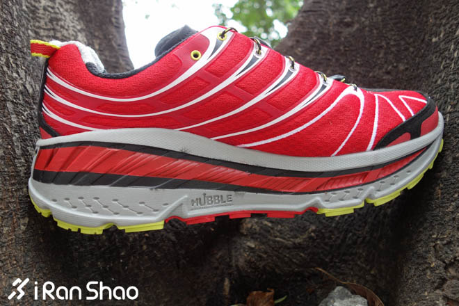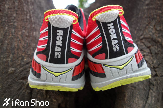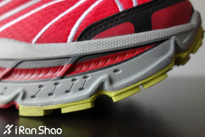 整个减震槽从后跟一直延伸到前掌,为了保证鞋子的灵活性,鞋子边沿做了很多向上的缺口。这些缺口按照人体跑步时候脚弯曲的位置设计。所以即使HOKA 体积上如此庞大,除了它的Meta-Rocker系统能让你的脚步更灵活之外,其他的时候就靠这些弯曲槽了。