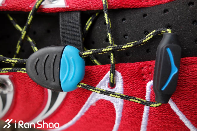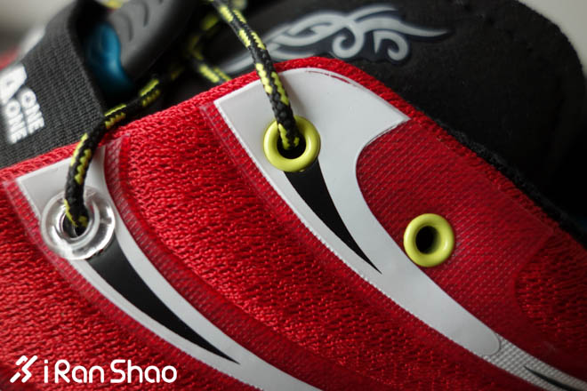 鞋面使用了2种“鞋眼扣”,塑料的透明“眼扣”和金属“眼扣”,塑料的透明“眼扣”与底部材料呼应,关键的起受力作用的最后两个“眼扣”使用了结实耐用的金属眼扣。