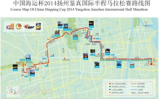 本届比赛半程马拉松路线图:起点(广陵新城江苏信息服务产业基地沙湾中路广新岗处)——文昌东路(北侧)——文昌中路(北侧)——(右转)泰州路右侧快车道——高桥路右侧快车道——五台山大桥南侧匝道上桥——(左转)漕河东路、漕河西路北侧快车道——(右转)友谊路中间快车道——(左转)平山堂东路、平山堂西路——(左转)邗江北路西侧快车道——(右转)文昌西路北侧快车道——国展岗(左转)——国展路西侧快车道—(右转)明月湖路—(左转)京华城西侧辅路—(右转)京华城路——(右转)博物馆路——终点(文化艺术中心公交站台处)
