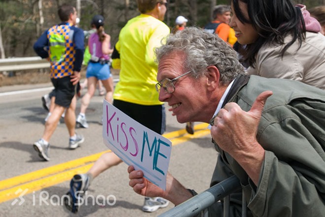 尖叫隧道(screaming tunnel)是美国最好的女校卫斯理所在的地方,比赛当天全校女生出动站在路边,尖叫声响彻天际。很多专业选手因为怕叫声引起身体不适,都会在这里带上耳塞。但是业余选手们到了这里如同打鸡血,都冲过去和女孩子们拥抱亲吻。因为她们很多人都举着牌子: i’m single,kiss me(我单身,吻我); or i’m a senior, kiss me(我二年级,吻我); or i’m a democrat, kiss me(我支持民主党,吻我)之类。总之模板是Kiss me,前面写啥不重要……