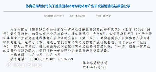 这会是体育总局今年的最后一个通告吗, 是关于体育产业研究基地 | 12月12日,体育总局经济司关于首批国家体育总局体育产业研究基地遴选结果的公示,卡宾滑雪、普华永道以及多所大学共16个基地上榜,此举是为了贯彻落实《国务院关于加快发展体育产业促进体育消费的若干意见》(国发〔2014〕46号)等文件精神,加强体育产业的前瞻性、战略性研究,并进一步加强和完善体育产业智库建设。