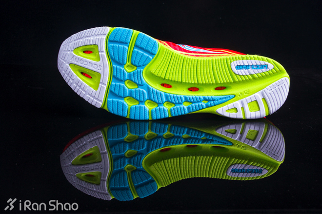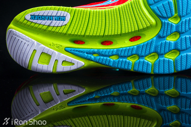 saucony type a6 底部有5个排水/排气孔。橡胶的分布注定这是一款以前掌着地为重点的竞速跑鞋。弯曲槽非常的明显,保证前掌的落地灵活性和加快反馈能力。但是没有中掌足弓保护支撑稳定功能,严重的后跟落地加扁平足跑者谨慎选择。