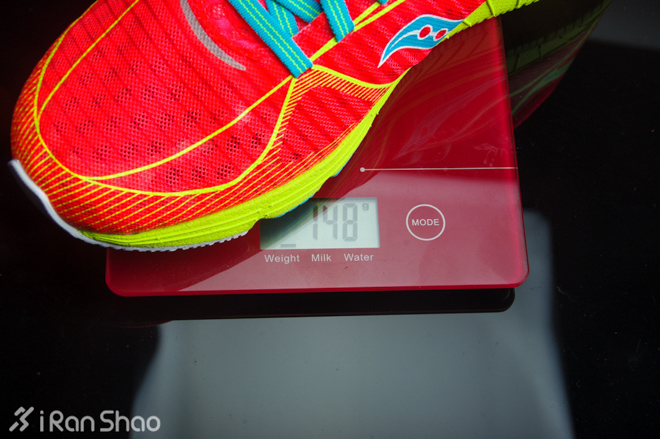 TYPE A6 单只重量只有148g,算得上一双非常轻量的跑鞋了。一片式鞋面,最少的减少拼缝,能保证赤足时候穿着舒适。鞋面各种工艺都非常的轻薄。