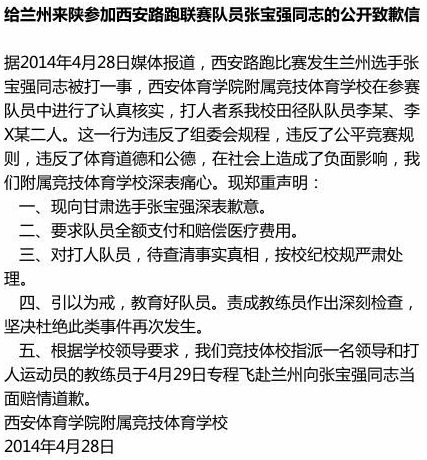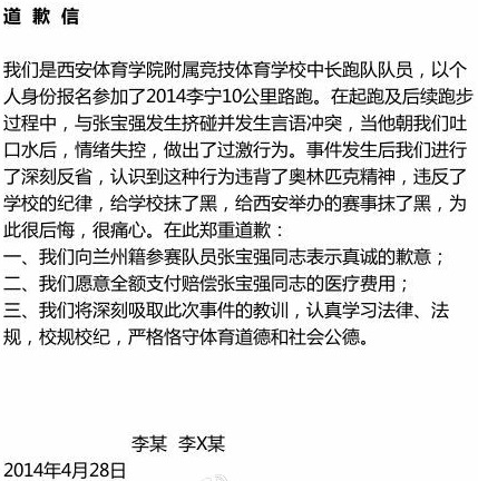 据华商报29日报道,打人者已找到,系西安某体校的两名长跑队队员。校方领导和打人者第一时间向外界公开致歉。两位队员或面临校纪的处分,组委会也将按照赛事规定对他们进行处罚。