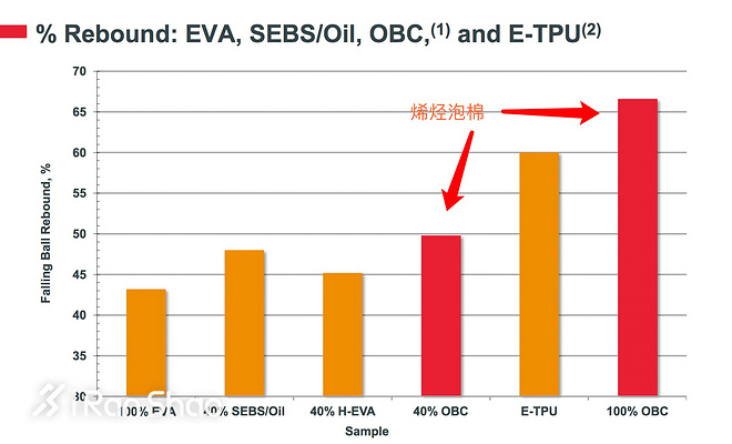 我在陶氏化学官网上找到了一份烯烃材料测试报告,回弹测试中由40%的烯烃泡棉制成的中底回弹性要比100%的EVA材料高7%,比采用40%高弹EVA材料的高5%,但都低于TPU材料。如果是采用100%的烯烃泡棉,它的回弹性比TPU中底还要高,并且高出7个百分点。足见烯烃泡棉的实力。