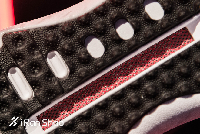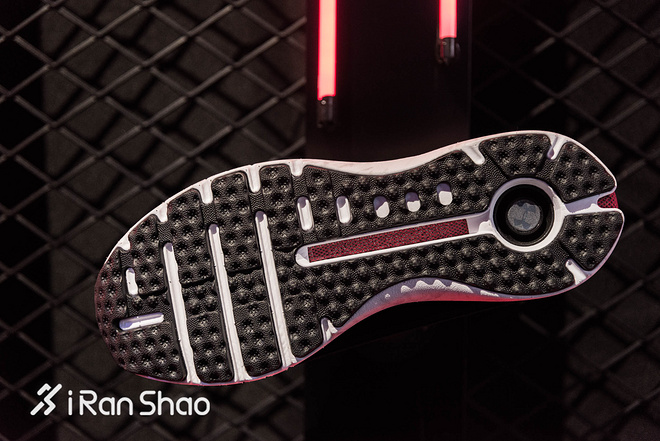 Phantom并没有采用全掌HOVR中底,而是一大块HOVR和传统Charged中底的组合。中底内镂空的网格材料便是HOVR,其他的都是UA过去常用的Charged中底。大底部分,采用全掌耐磨橡胶,搭配圆形凸点设计。