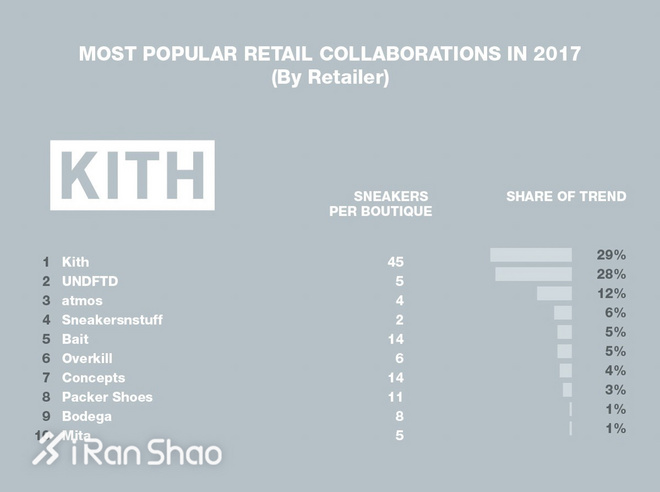 而纽约时尚名所KITH成为了各大运动品牌最爱联名的品牌,其次是UNDFTD和atmos。