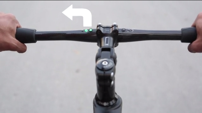 而得知最佳线路的智能自行车便会在行车过程中进行导航,通过车头把手的LED感应灯对你做出方向的提示。