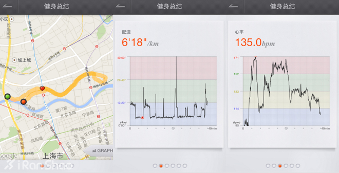 iriverOn通过智能手机的专用app才能够实现运动心率监控的功能,在安卓与app store都可以搜索到iriverOn的原生app应用。整个app的结构与跑者们熟悉的nike+ running相仿,通过iriverOn的PerformTek生物感应技术和手机的GPS模块来进行运动过程中数据信息采集与统计分析,数据信息包括运动轨迹地图,心率,配速,步幅等,在运动结束后能够通过图表的形式进行运动状况的直观呈现。