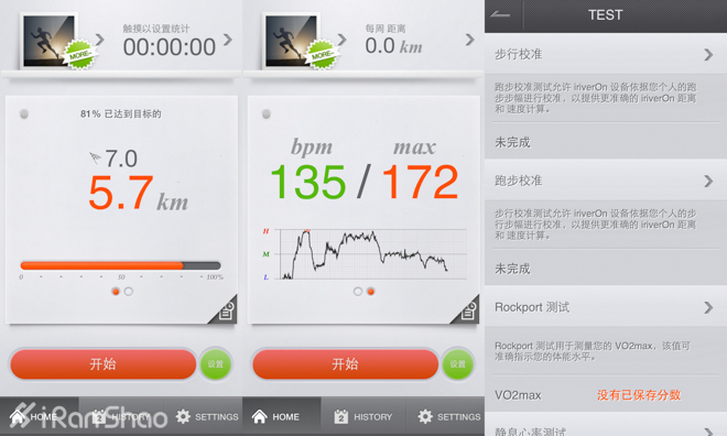 十分意外的是我们居然在iriverOn的测试栏目里看到了对VO2max(最大摄氧量)的评估,这瞬间让iriverOn在我们的心目中的地位又高大了不少。毕竟我们也只是在Garmin Forerunner 620这样最新的专业运动腕表上才会发现如此专业的功能设定。