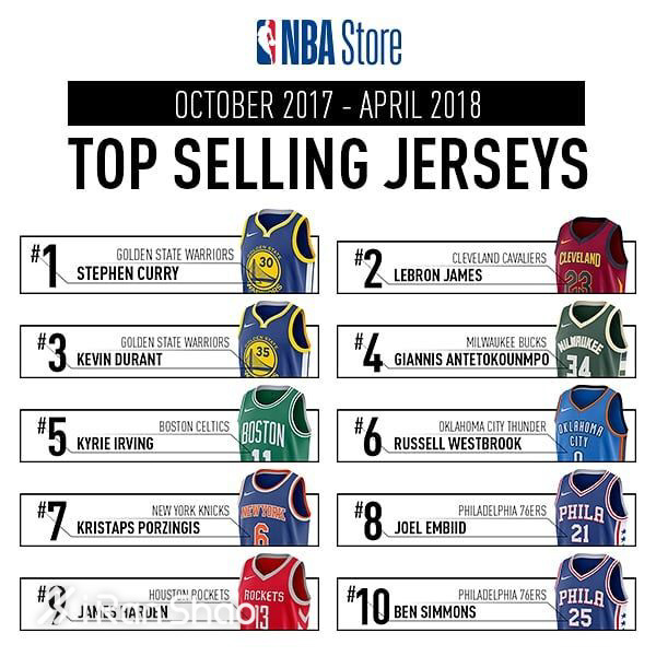 球队商品销量榜方面,卫冕冠军勇士队也连续第3年排名第一,随后是骑士、76人、湖人、凯尔特人、雄鹿、雷霆、尼克斯、公牛和火箭。