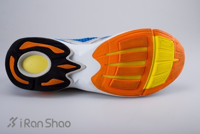 鞋底又是一番别有洞天,前掌区域由橙色和香蕉黄两种颜色的EVA凸起,分为4格区域均匀的分布。可以看到四块橙色的凸块足有7,8毫米厚,前面的香蕉黄凸块则从2,3毫米逐渐过度与前底持平。凸块的整体弹性和稳定性都非常出色。整个前脚掌看起来有些突兀,不过这也正体现newton 的重要研究成果。
