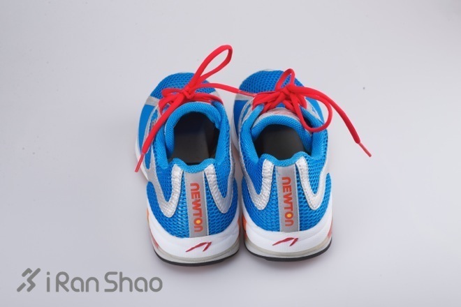 首先这双鞋的外观,纯蓝色主体与正红色鞋带撞色搭配非常出挑,作为修饰的银色条纹和白色鞋底,使整双鞋都显得干净轻盈。鞋侧的深红色塑料logo制作精细,折射出品牌的内敛格调。鞋跟后侧的红色NEWTON字体及俏皮的小辣椒logo给人轻松自由的感觉。