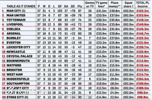 英超2017/2018奖金分成公布,曼联居首位 | 《每日邮报》报道了英超各队本赛季奖金分成情况。奖金由平均分成(8200万)、排名奖金和转播分成构成。