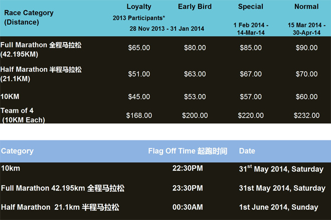 赛事定于每年5 -6月举行,于11月开始公布次年比赛信息及报名详情。设有10km,半程21. 1km和全程42.195km三个距离的比赛项目,亦有4人组队各跑10km的接力项目。报名费45-90新加坡币,视乎报名类型,往年参赛者享有特别优惠,同时越早报名优惠越多。有兴趣的跑友,可提前留意官方网站公布的比赛信息(http://www.sundownmarathon.com)。Sundown马拉松今年于5月31日举行,目前已截止报名。感兴趣的跑友,可于年底留意2015年的比赛信息,提前做好报名准备。