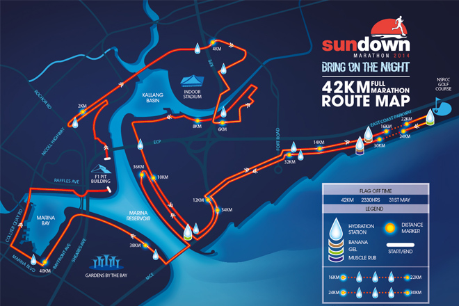 2013年Sundown马拉松的主题是Show Your True Colours,而今年的主题是 Bring On The Night。每一届的主题都很Cool,但不变的是它能让你感受一个不可思议又难忘的夜。在这疯狂的夜里,你可以跟上万名的跑者一起挑战各种困难,或跟着官方的比赛兔子,跑过新加坡最干净的街道、东海岸公园、滨海公园、“大榴莲”艺术中心、最美丽的Marina Bay滨海湾、鱼尾狮像……最后战胜黑夜,战胜酷热,战胜自己,在大摩天轮下完满冲过终点,尽情享受马拉松的真正乐趣。