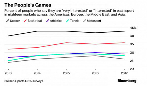 尼尔森数据调查,足球仍是世界第一运动 | 尼尔森公司统计了全球的18个体育市场,发现有43%的受访者表示自己在2017年对足球「感兴趣」或是「很感兴趣」。排在第二位的运动是篮球,36%的受访者表示感兴趣。