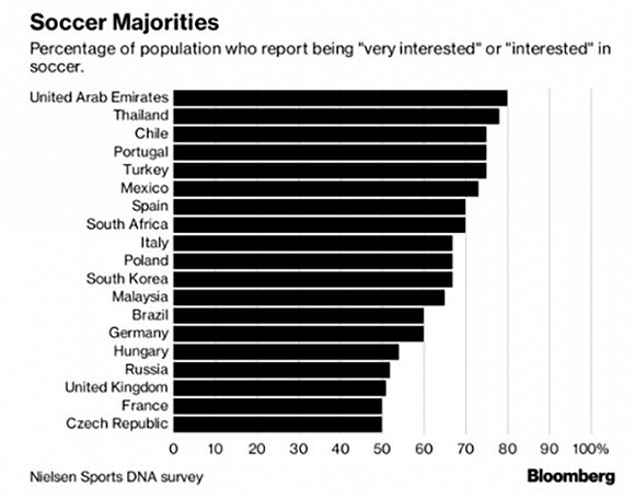 报告显示,足球依然拥有其他体育项目无法比拟的地位。大多数人口选择对足球「感兴趣」的国家数量达到了19个,但是其中并不包括美国和中国。