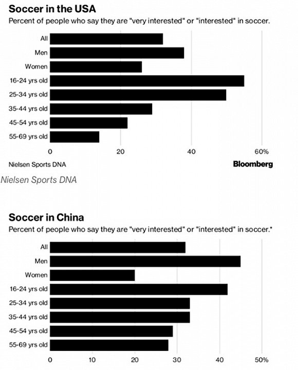 在美国和中国,有32%的受访者表达了对足球运动的兴趣,年轻人要比上一辈更加青睐足球。