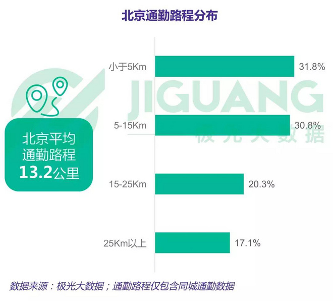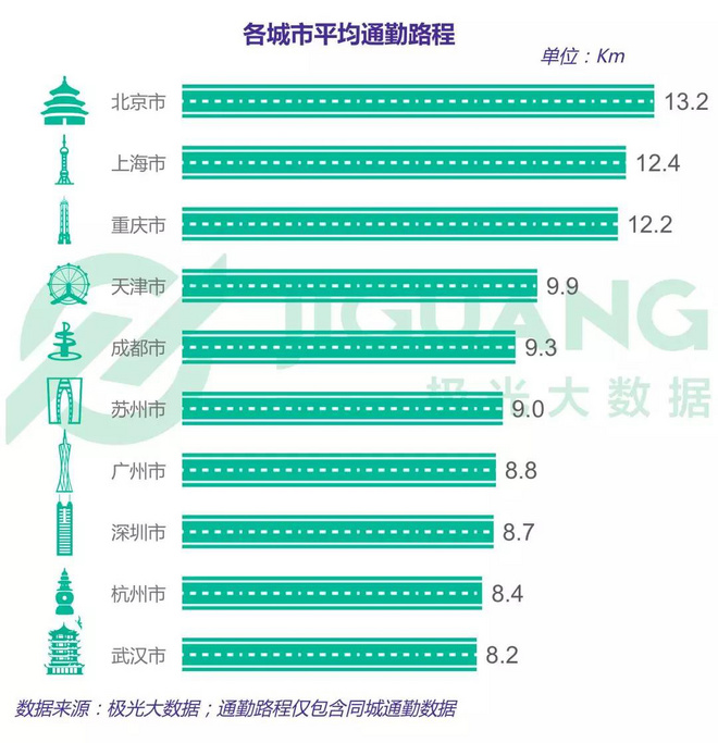 北京居民通勤最痛苦,平均通勤路程13.2km,平均用时达56分钟;