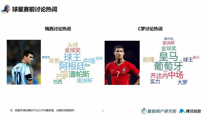 另一份腾讯指数数据显示,中国市场中,梅西、C罗赛前用户讨论热度最高,90%通过互联网关注世界杯。