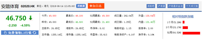 相应地,安踏股价一度冲至49.2港币,涨幅达到1.45%,创下上市以来历史新高,市值已经突破1300亿港币。