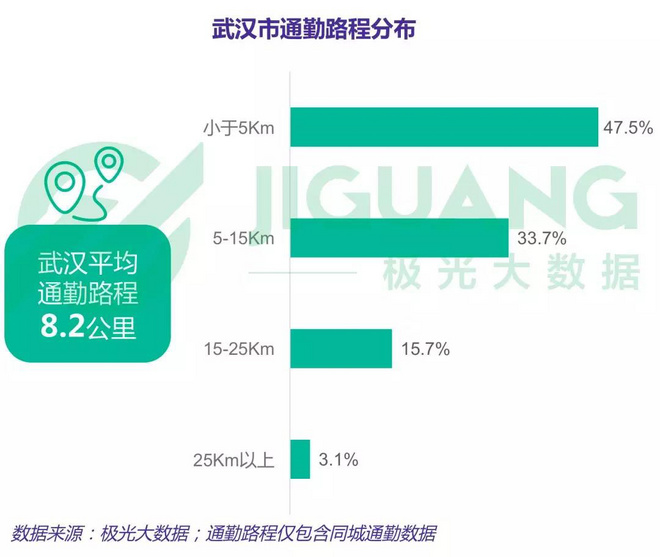 武汉人民通勤最轻松,平均通勤路程为8.2km,97.7%的武汉人民通勤时间在1小时以内;