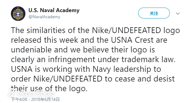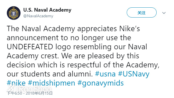 本周发布的Nike/UNDEFEATED徽标和USNA Crest的太像了。海军学院正与海军领导层合作,望Nike/UNDEFEATED停止使用该徽标。