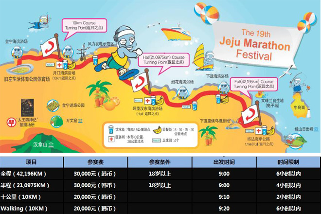 济州岛马拉松全程沿海从“旧左生活体育公园体育场”(金宁海滨浴场)出发,途径“月汀海滨浴场”“坪岱汉东海滨浴场”“细花海滨浴场”“下道海滨浴场”“下道里候鸟栖息地”“海岸公路”后折返,除了10公里、21公里和全程马拉松之外,还有一个10公里的WALKING组别,6个小时关门。非常适合亲子活动。海边沿途会有很多有特色的咖啡厅,走累了,可以停下来喝杯咖啡休息一下听听海。现在官方(网址:http://www.jejumarathon.com/(内含中文版网页))报名已经结束,但是济州岛旅游局预留了很大一部分的名额给中国的跑友,你可以联系当地的韩国旅游局进行报名。