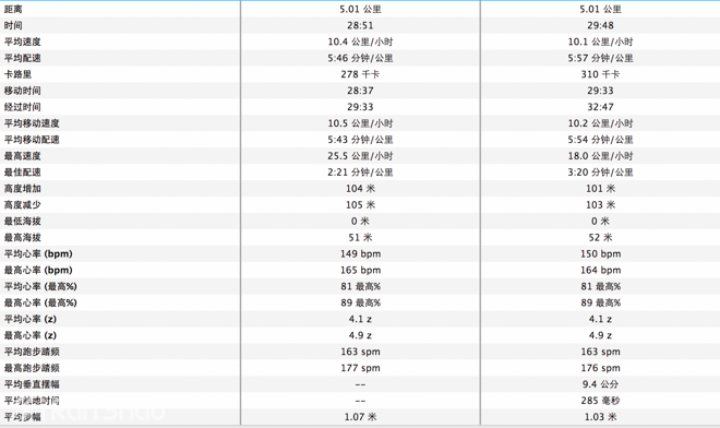 在关键的GPS模块上,官方没有给出FR220与FR620的参数区别,在实际应用中,两款手表在初始的搜星时间上不相上下,甚至FR220还要略快;同样在轨迹定位上,两者的差距依然不是十分的明显;只有在即时配速的显示上,FR620的准确性更加的突出一些,某些时候FR220的即时配速会出现较大的误差而让跑者摸不着头脑。下图是小编分别使用FR220与FR620在相同路线,相同距离,进行训练后的行程数据记录,可以看出在GPS数据记录上,两者基本没有偏差。