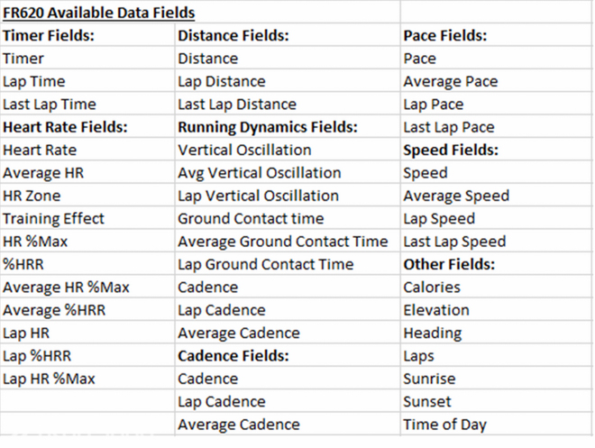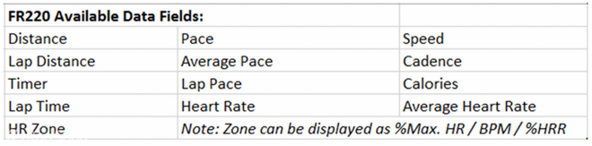 下面两张则分别是FR220与FR620可记录行程参数的图表,从这两张图表上我们就可以直观的看出这两款同门产品最核心的区别所在了:FR220的可记录行程参数大致涵盖了配速,距离,时间,心率,步频以及绕圈信息等13项基本数据;而FR620则在FR220的基础上增加了运动力学,环境信息,以及更为详尽的多达44项的数据信息记录。