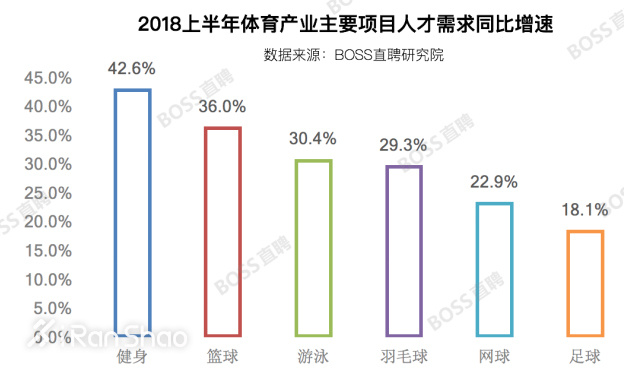 大众健身领域的人才需求增长势头最为强劲,2018 年上半年人才需求同比增速达到 42.6%,篮球、游泳项目分列二三位;