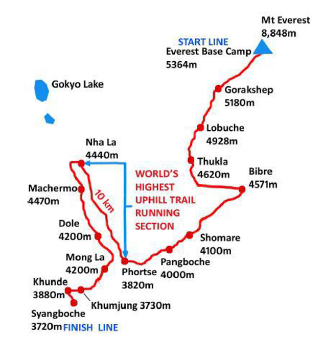 全程马拉松的线路与当年希拉里与丹增开辟的登山线路前半段大致吻合,大部分的赛道都是下坡路段,而唯一的一段将近10km陡峭上坡也许将是世界上海拔最高的爬坡赛道了。