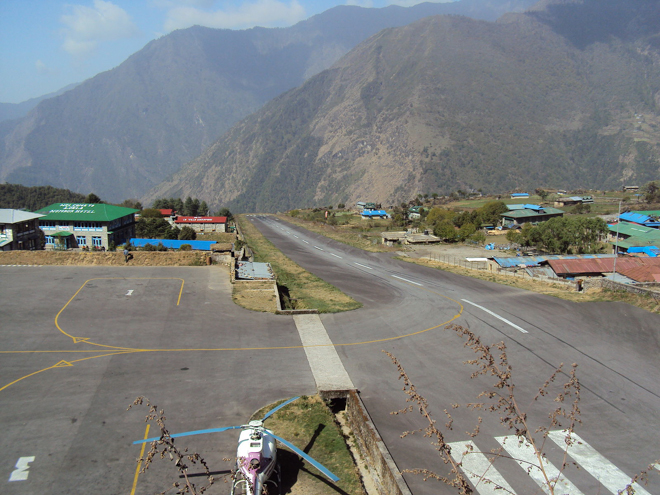 珠峰马拉松赛事的险恶从前往比赛地的时候便已经开始。从尼泊尔首都加德满都前往珠峰地区的航班是一条著名的死亡航线,连年频繁的事故让人们对这条珠峰航线望而生畏。位于珠峰脚下的卢克拉机场则被誉为“全世界最危险的机场”,跑道尽头的一边是悬崖,另一边是绵延的喜马拉雅山脉。为了帮助飞机在降落时减速和起飞时加速,跑道采用了倾斜式的设计,但这样的设计也使的飞机一旦出现问题就将坠入万丈深渊。