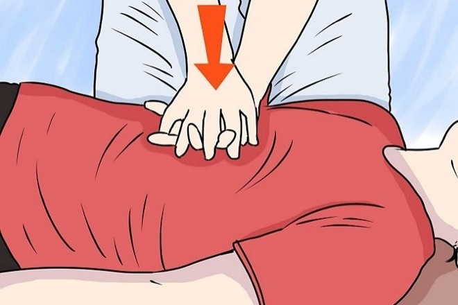 - 跪坐在伤者一侧,将一只手的掌根放在胸骨的下半部(具体位置为乳头连线的中点),手指翘起,另一只手从第一只手的手背上扣住指缝;